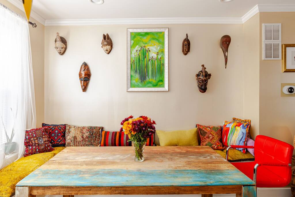 Thoughtfully crafted for travelers who value genuine connection. Our lovingly curated 2BR/2BA home in historic Anacostia welcomes you and your pets with handpicked African art, a chef's kitchen built for gathering, and peaceful deck moments. Steps from metro, museums, and arenas—yet feels like your own retreat. Every detail reflects our commitment to your comfort, from secure parking to the warmth that makes this more than just a stay